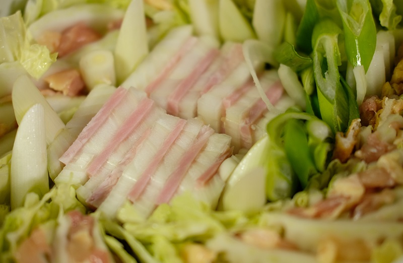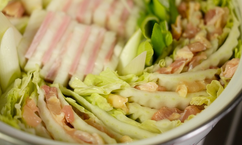 白菜と鶏肉をはさんではさんで鍋に敷き詰めて…