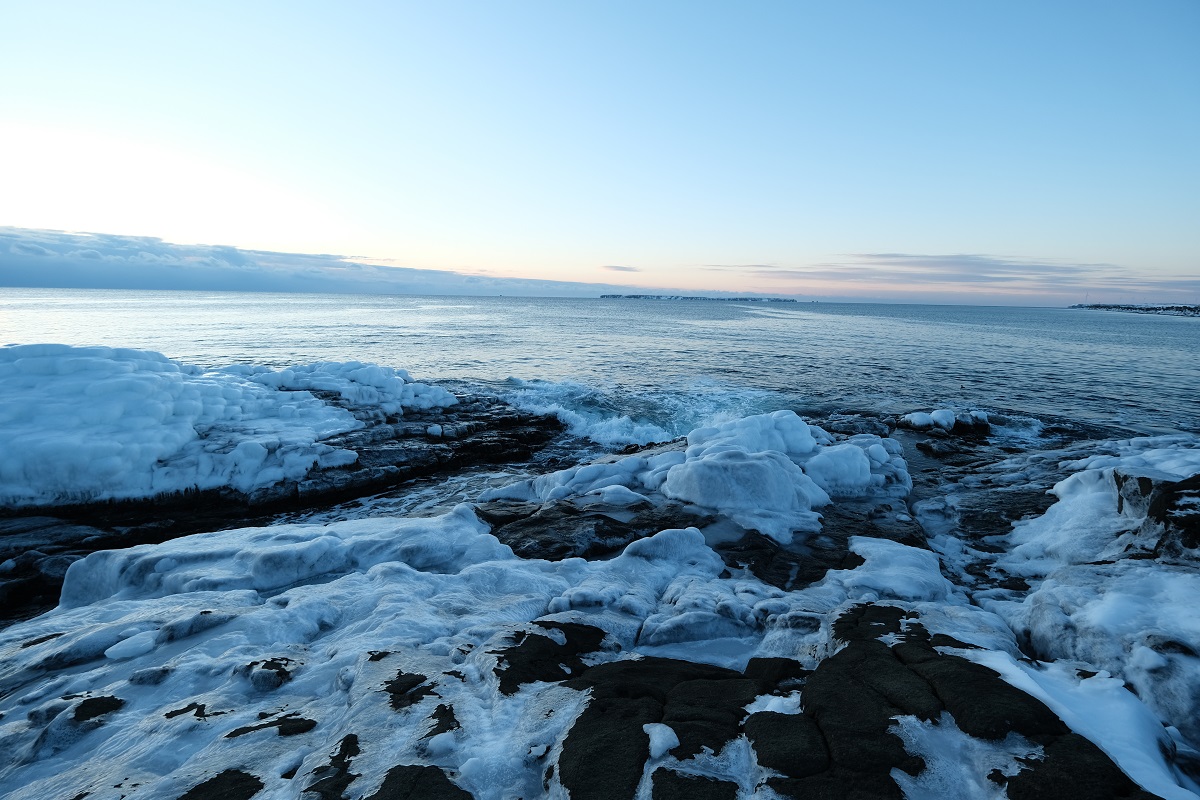 波打ち際、足元が並みの形に凍っています(@@)