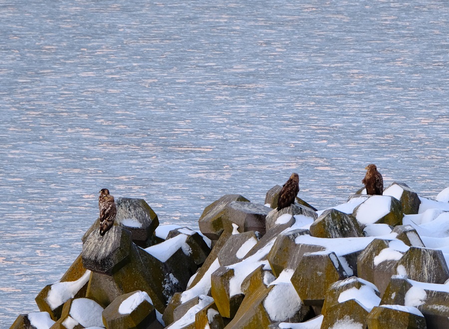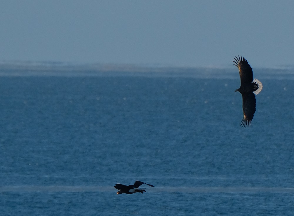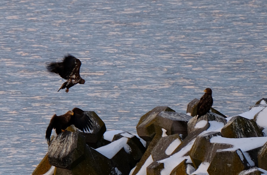 「あ!!オオワシとオジロワシがエサ獲りの争いしてる!!」