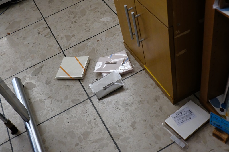 展示用のチェキが床に落ちていたり、額が倒れたり