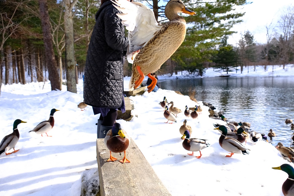 カモにパンくずをあげている人の横で、カモを撮影していると…
