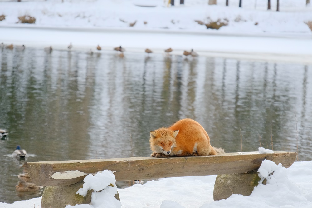 そして珍しい、キタキツネの「ひなたぼっこ」に遭遇(笑)