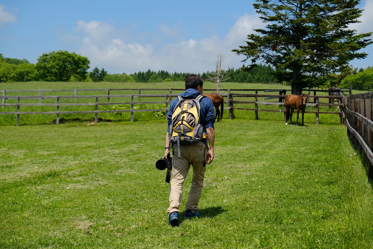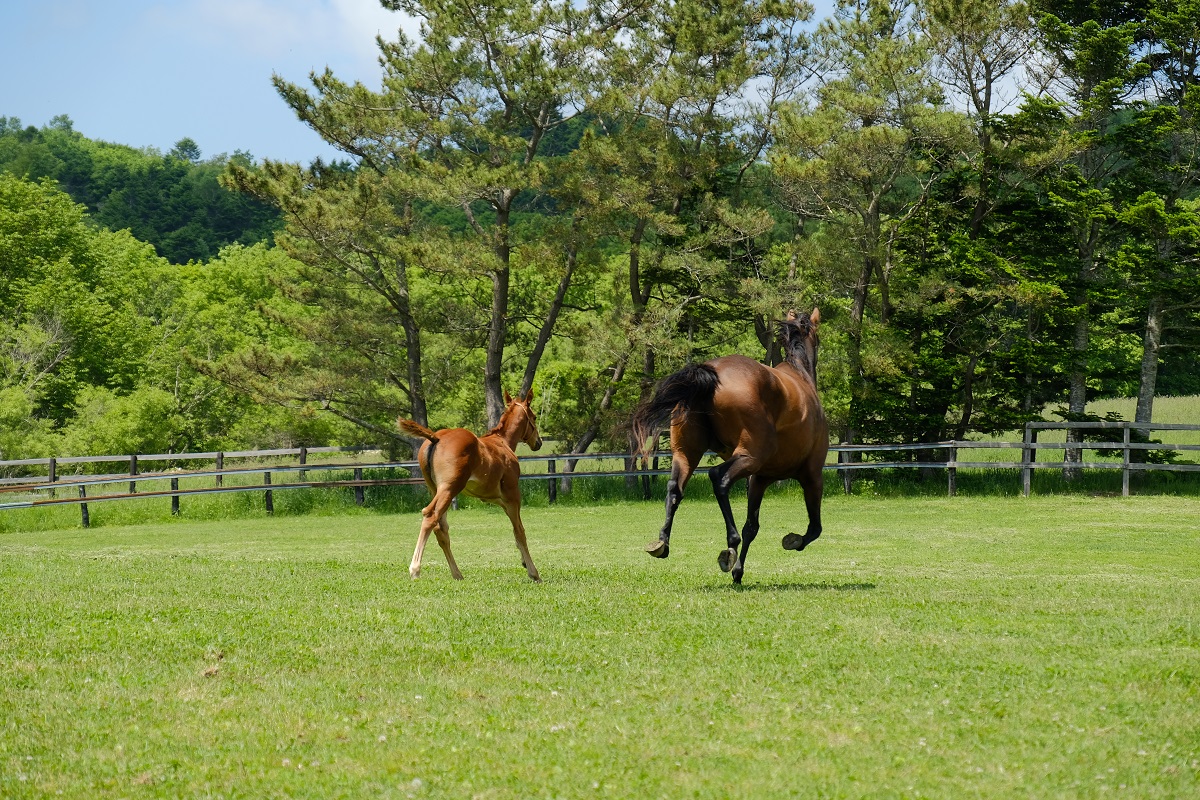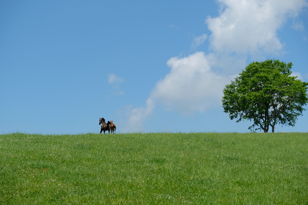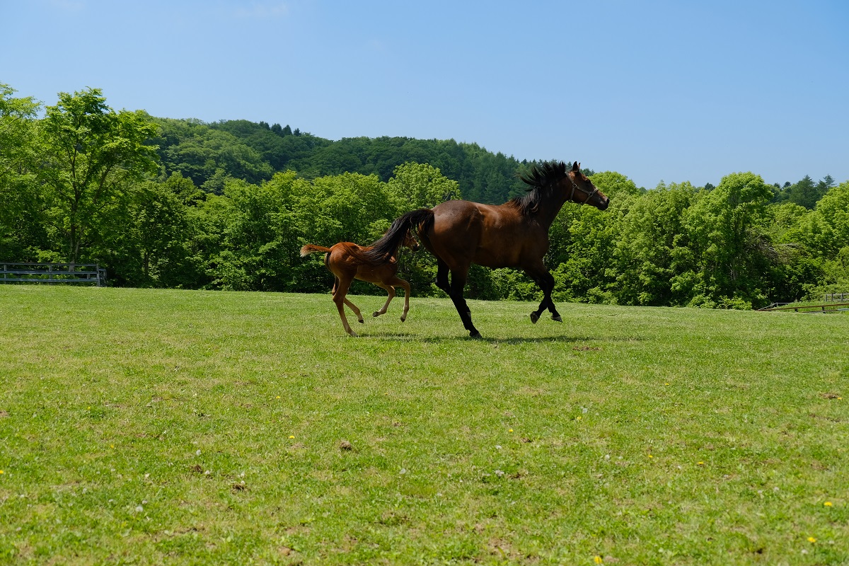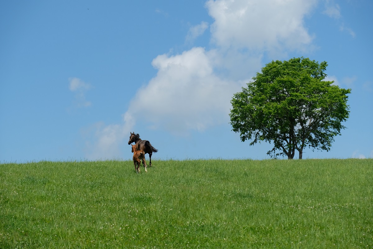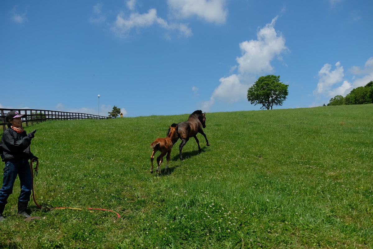 放牧された親子馬は、あっという間に丘の上へ消えて行きます~